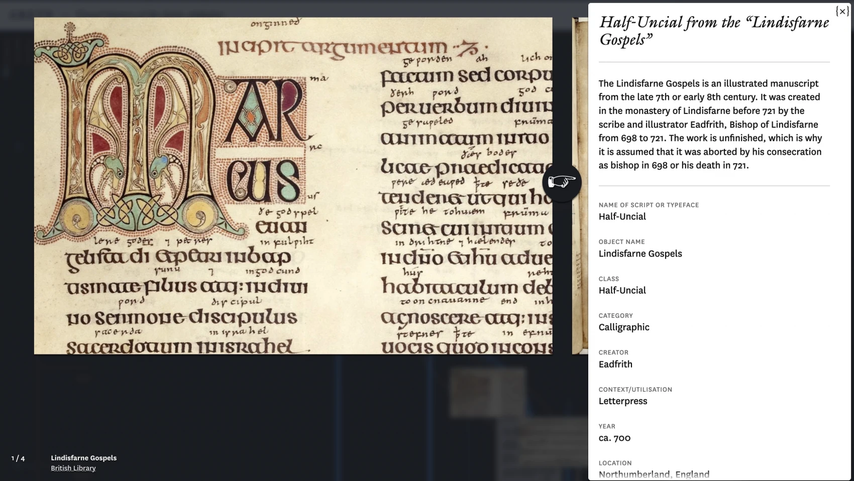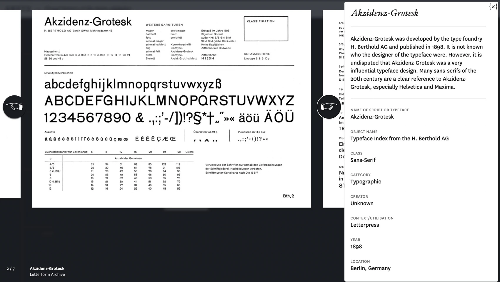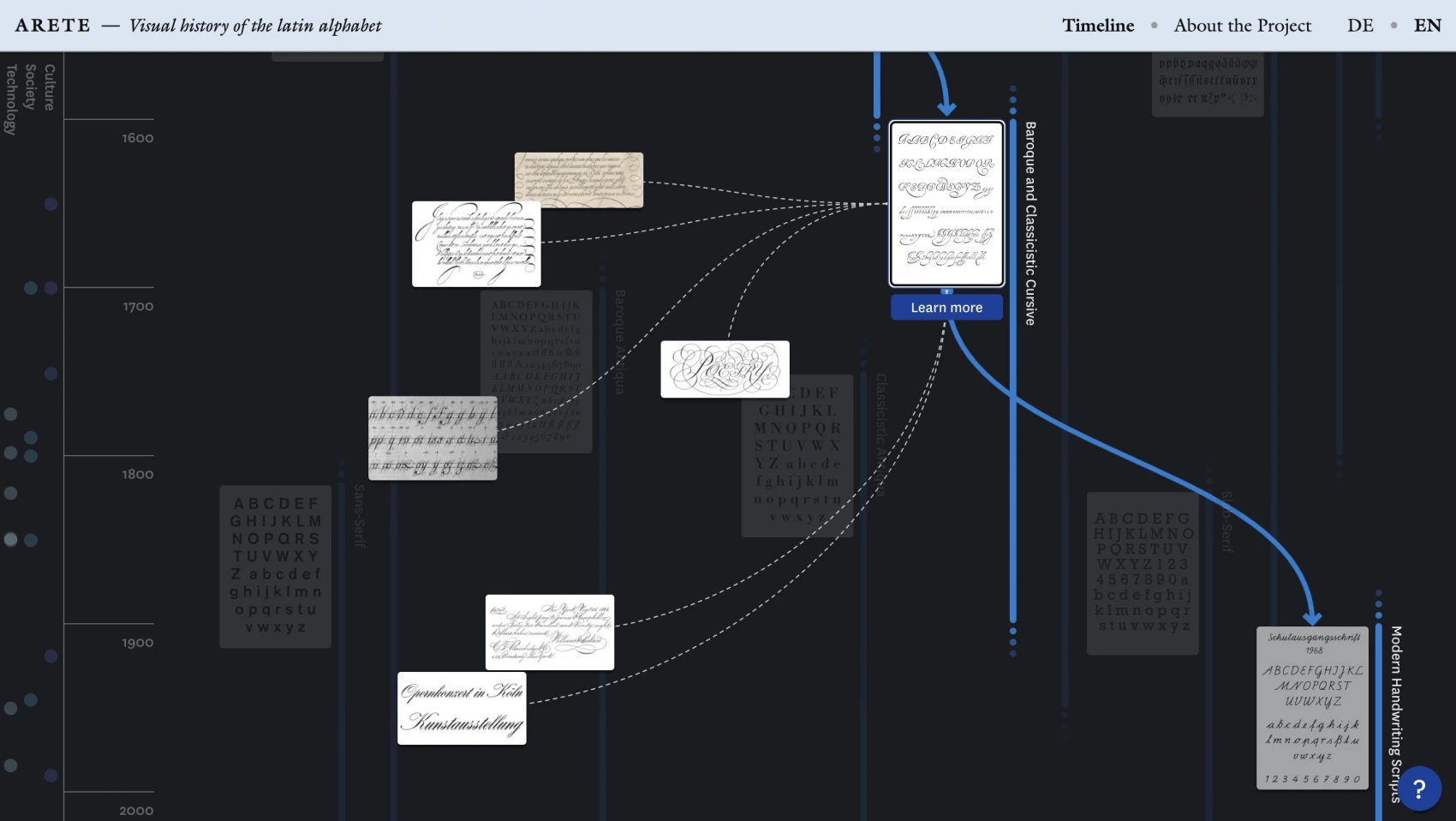 In order to better understand the historic context of the different scripts and typefaces, a timeline with events from society, technology and culture is located on the left side of the visualization. These events offer orientation and provide a general historical framework.