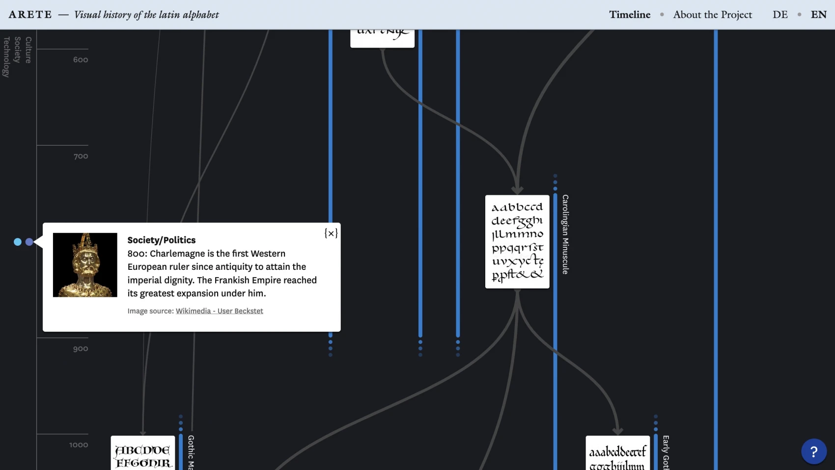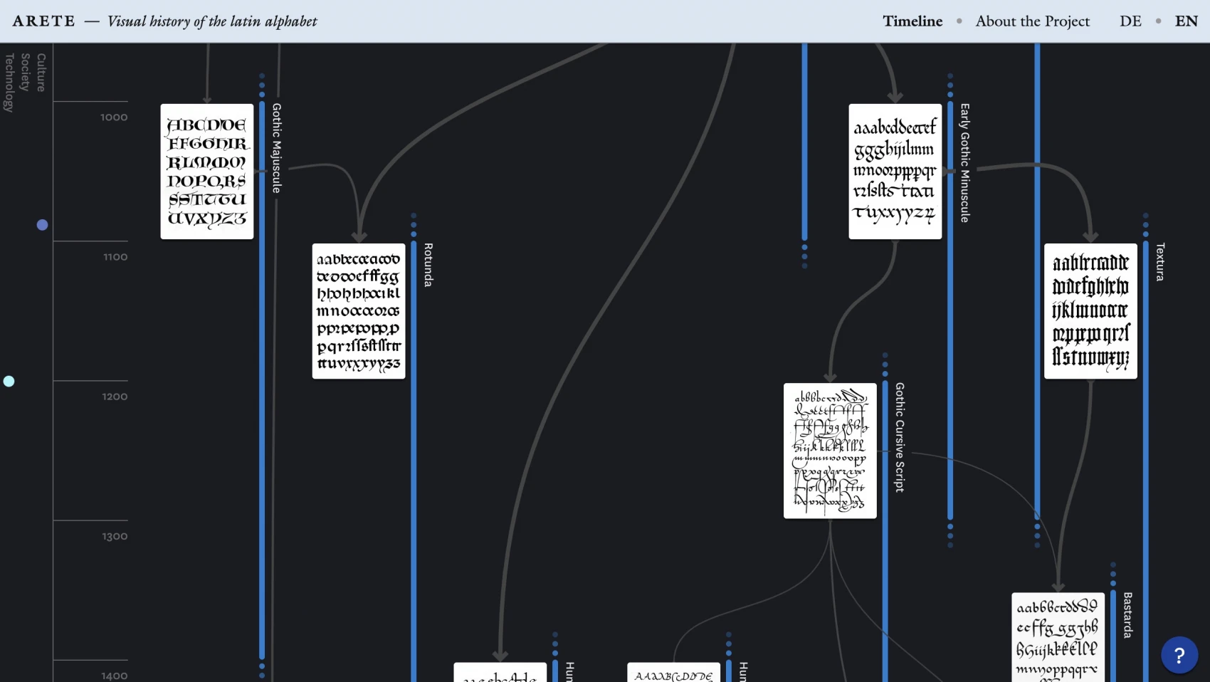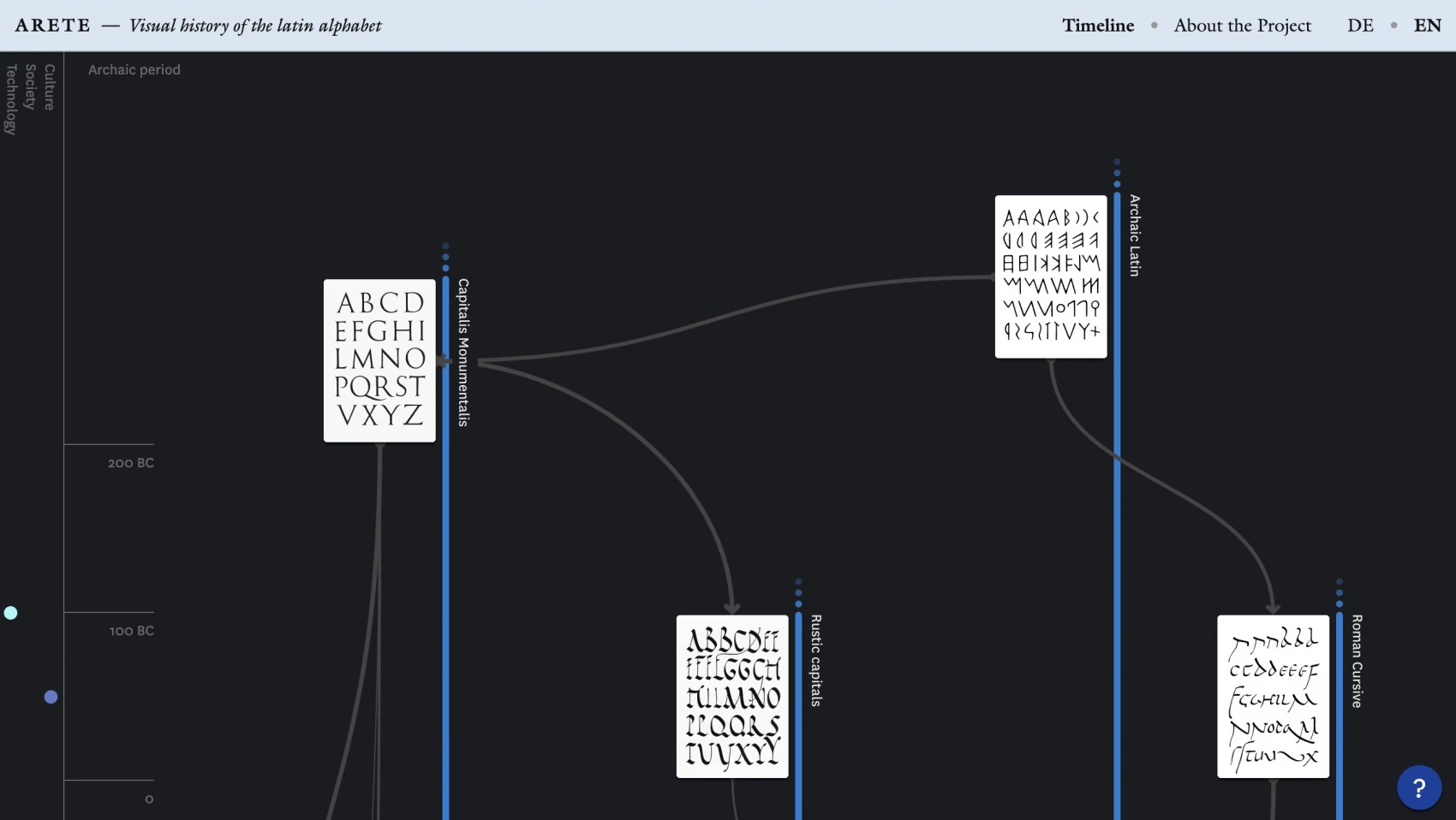 The ARETE project is an interactive visualization of the history of the Latin alphabet. In particular, the visualization shows the temporal and formal relationships of the different scripts and typefaces to each other.