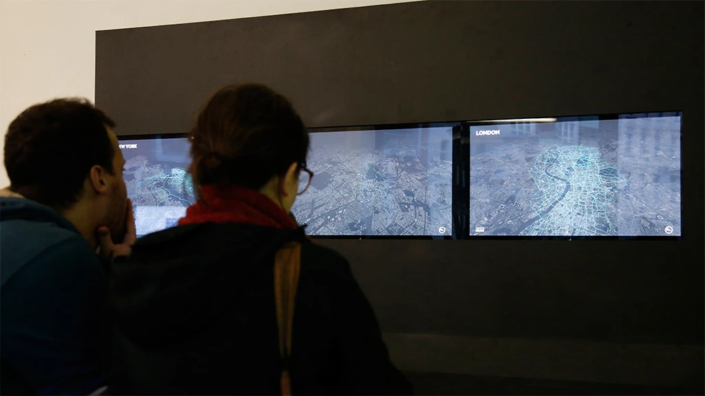 We aimed to design our system in a highly aesthetic style in order to attract visitors in a semi-public space such as an exhibition area. Multiple cities are shown side by side to allow comparison with the each other. The views of all three cities are coordinated, and show the same time of day, and have the same map scale. Visitors from one of the shown cities can relate and compare known stations and areas with similar ones from other cities.