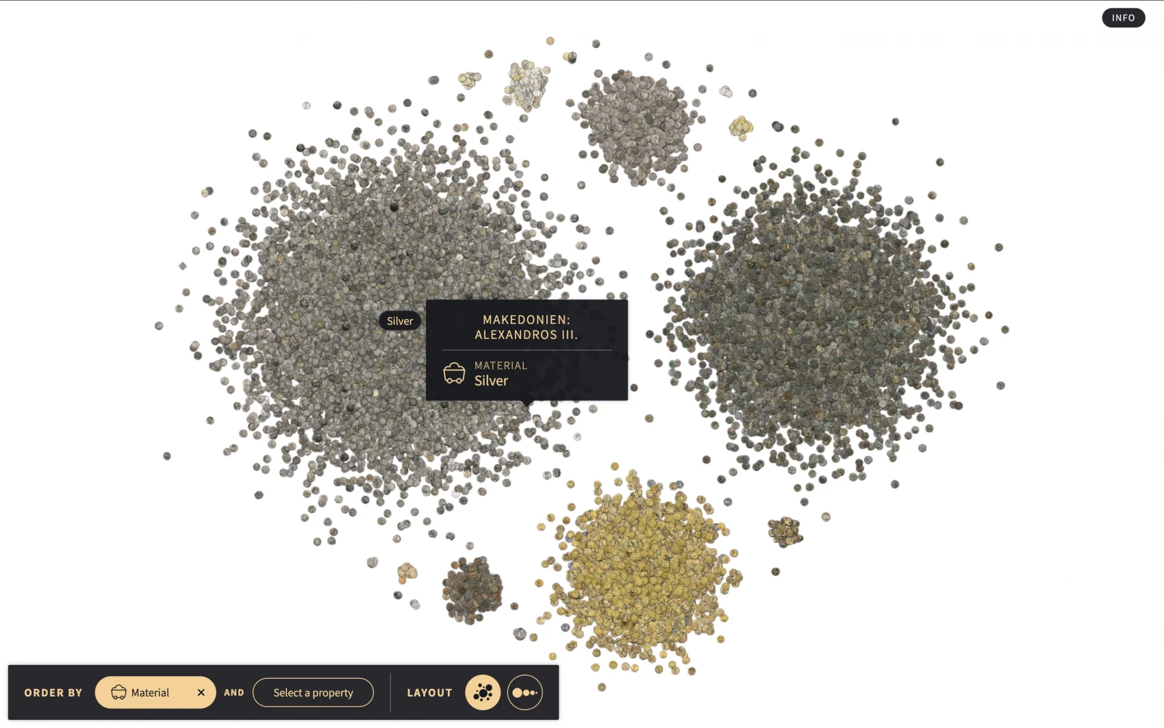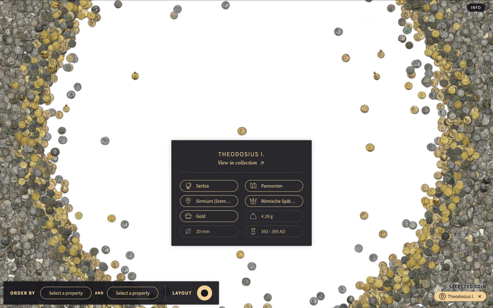 Comprising over half a million coins and medals, the Münzkabinett Berlin is one of the most significant numismatic collections in the world. The Münzkabinett has been investing considerable resources into digitization processes over the past ten years with a strong focus on the semantic annotation of the historic coins and publication via web portals. Despite theses efforts to expose the collection more broadly, the physical and digital display of the collection has been relatively limited. The coins almost always end up in tabular grids: regardless whether in the storage drawers of the depot, the glass cabinets in the exhibition, or thumbnail pages in the online collection. While ubiquitous across collecting institutions, these static and rigid arrangements lack the potential to convey the semantic relationships and physical patterns embedded in this large collection.