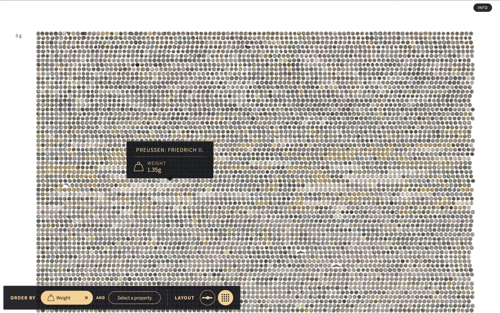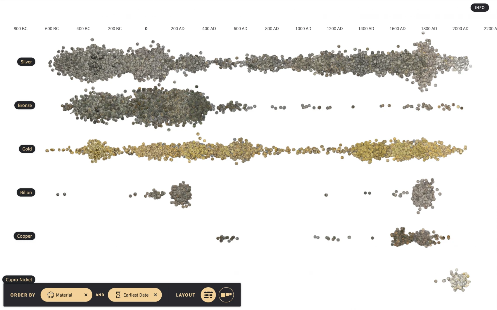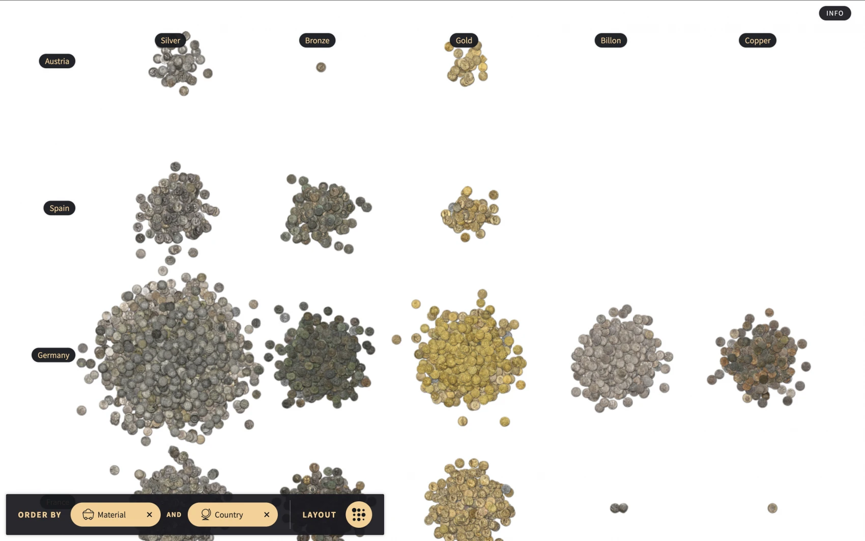 The resulting visualization system represents the numismatic collection using overview layouts that relate the material nature of the coins with their historical context. In the dynamic arrangements it becomes possible to gain an impression of its total size and generate new insights by sorting the coins along diverse criteria. These layouts reminisce physical arrangements of coins that detest the rigid order of tables and grids. For example, coins can be placed into separate piles each representing a given metal type or country of origin. Another layout is a stream that visualizes the ebb and flow of coins that can be teased apart by another dimension such as coin type. Across all these arrangements the visualizations are made up of the images of the coins. When a parameter of the layout is changed all coins gradually rearrange themselves resulting in evocative transitions.