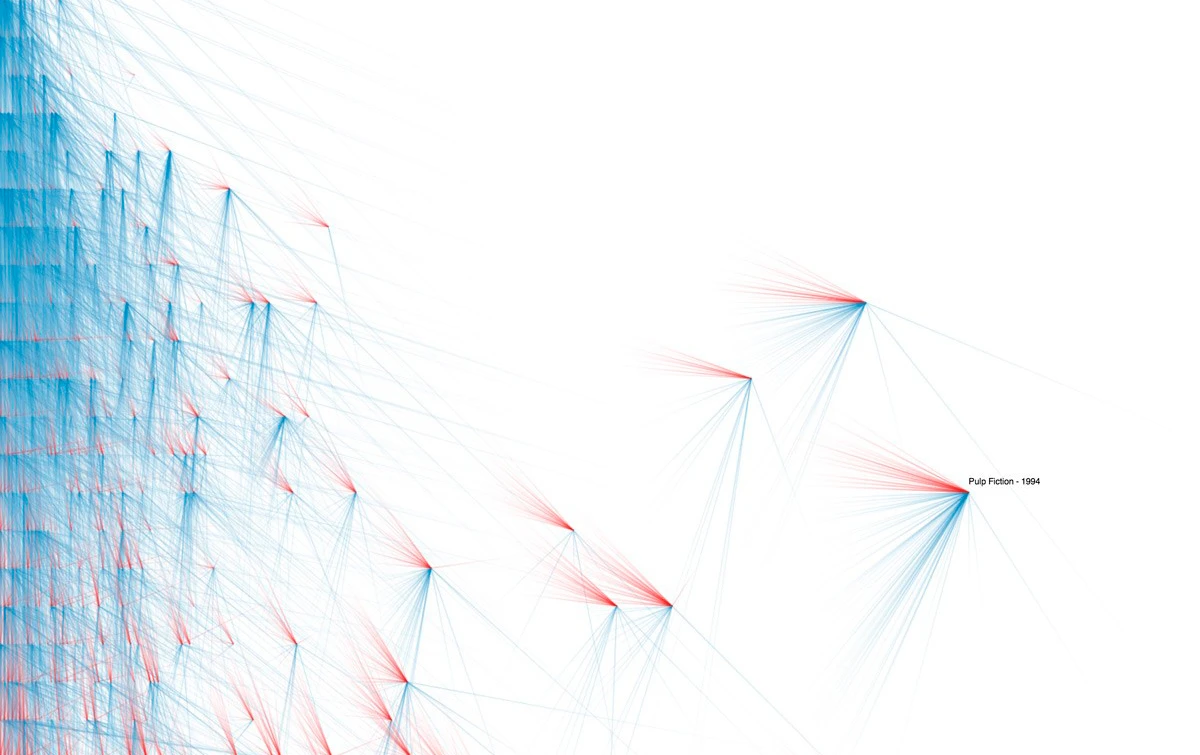 The visualizations are based on data from IMDB (The Internet Movie database) which is an Online movie community with 42 million users. IMDB collects all kinds of information about movies, one part is a collection of references between movies. In the database these references are stored under the menu point »connections«. There are nine different reference types (alternate language version of, edited from, features, follows, references, remake of, spin off from, spoofs & version of ). For the visualization we focused on the category »reference«. The dataset contains 119,135 such connections from 42,571 movies. To be able to responsively visualize the data in a web browser we selected the 3,000 most connected movies by in-degree and their 10,000 connections to each other.