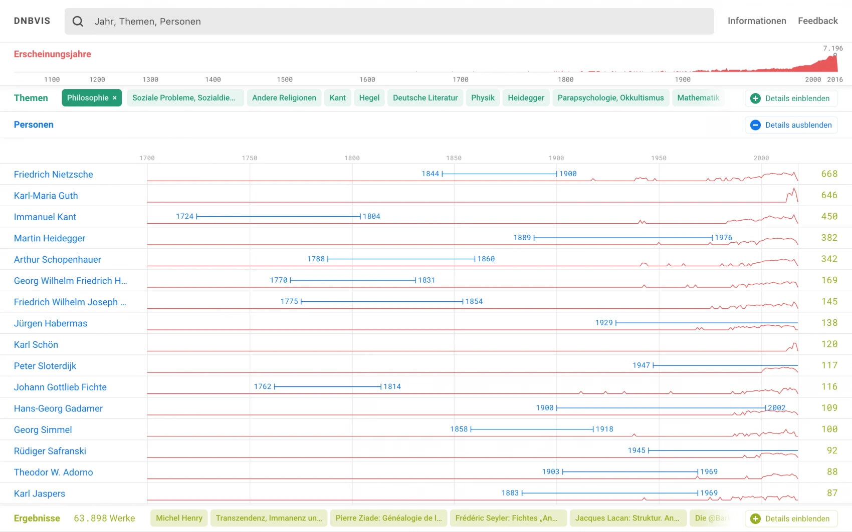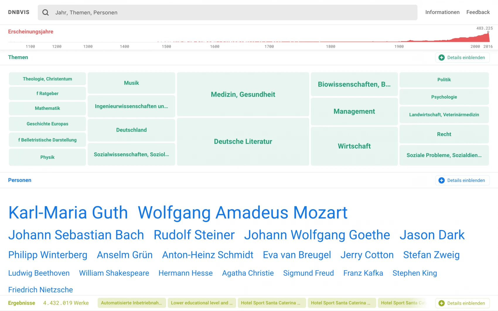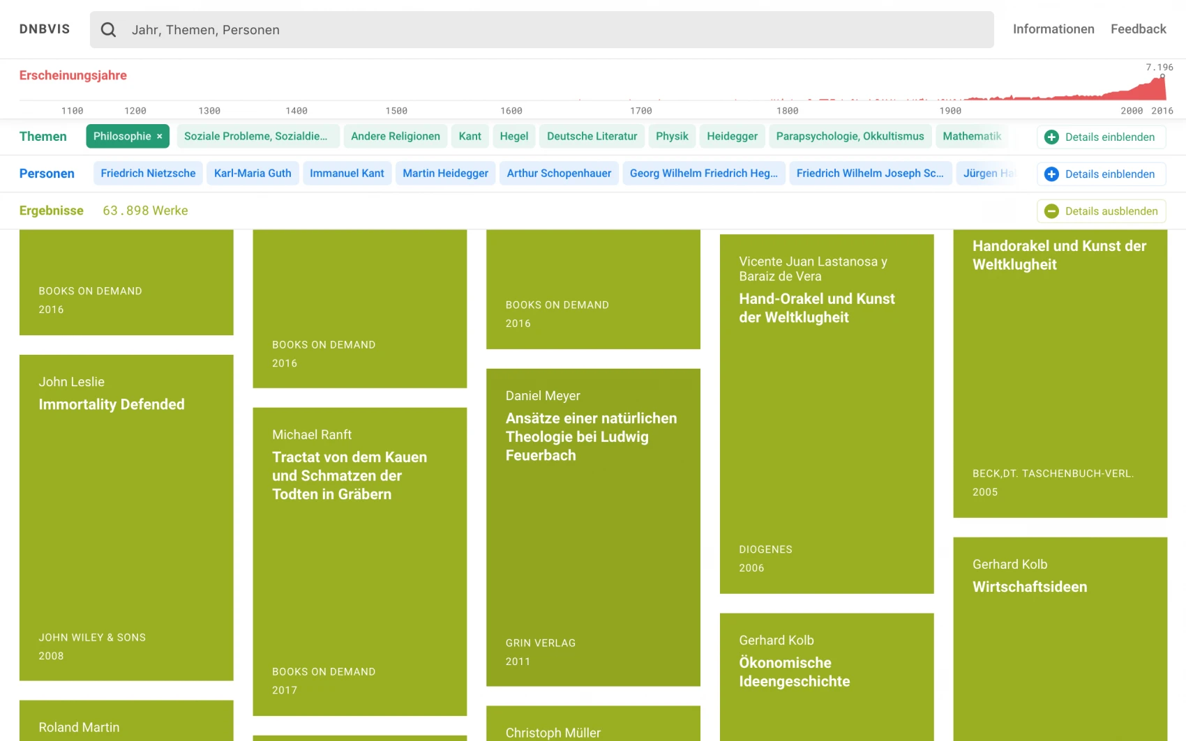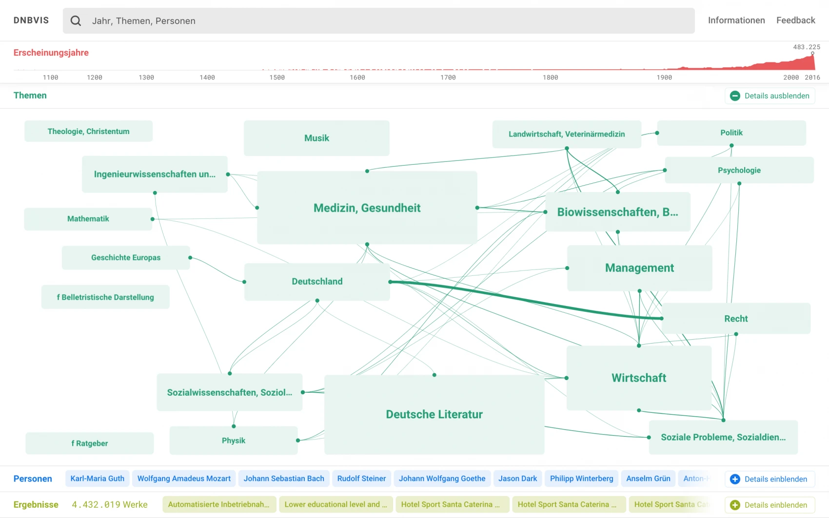 Together with library networks and other institutions, the German National Library is responsible for the standardization, integration, and maintenance of various authority files in the context of the "Gemeinsame Normdatei" (GND), which can be considered the lingua franca for metadata on German works. Based on rich data relations and interactive and graphical capabilities of modern browsers, new possibilities emerge for the visual exploration of comprehensive collections. However, so far most search interfaces lack any inviting access revealing the relationships among resources and entities.