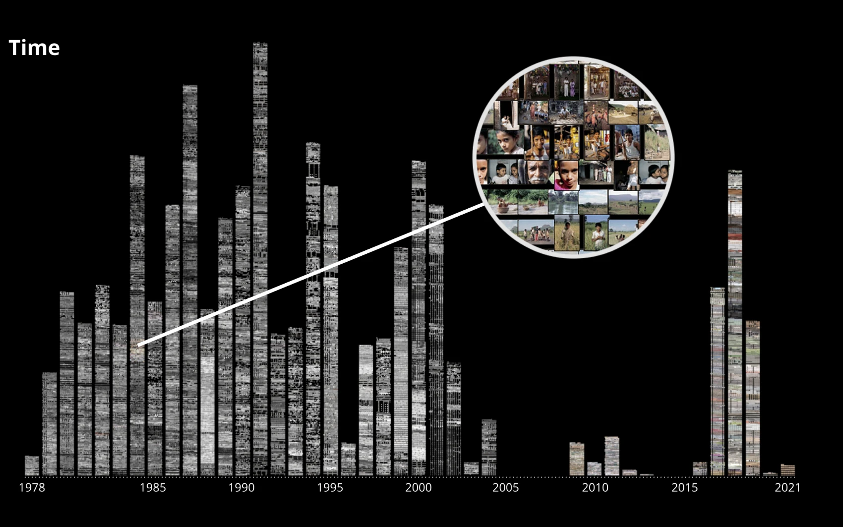 The project builds on research in cultural studies, digital humanities, information visualization, and human-computer interaction. While great efforts have been made in recent years in digitization and online publication, the modes of presentation continue to rely on grids of thumbnail images of the same size and format, which are arguably not able to harness the potential that lies in digital access. Our research aims to find means of making the dimensions of processuality, selection, and materiality, which have been left behind as traces in the archive, visible. We aim to design and evaluate visualization and interaction techniques to enable navigation between different levels of granularities with regard to semantics, relations, hierarchies, photographic processes, and visual elements. Our central ambition is not to reduce the data in favor of uniformity or clarity, but to show the richness and depth by conceiving visual instruments that reflect the archive’s complexity and harness emerging technological developments to do justice to the cultural artifacts.