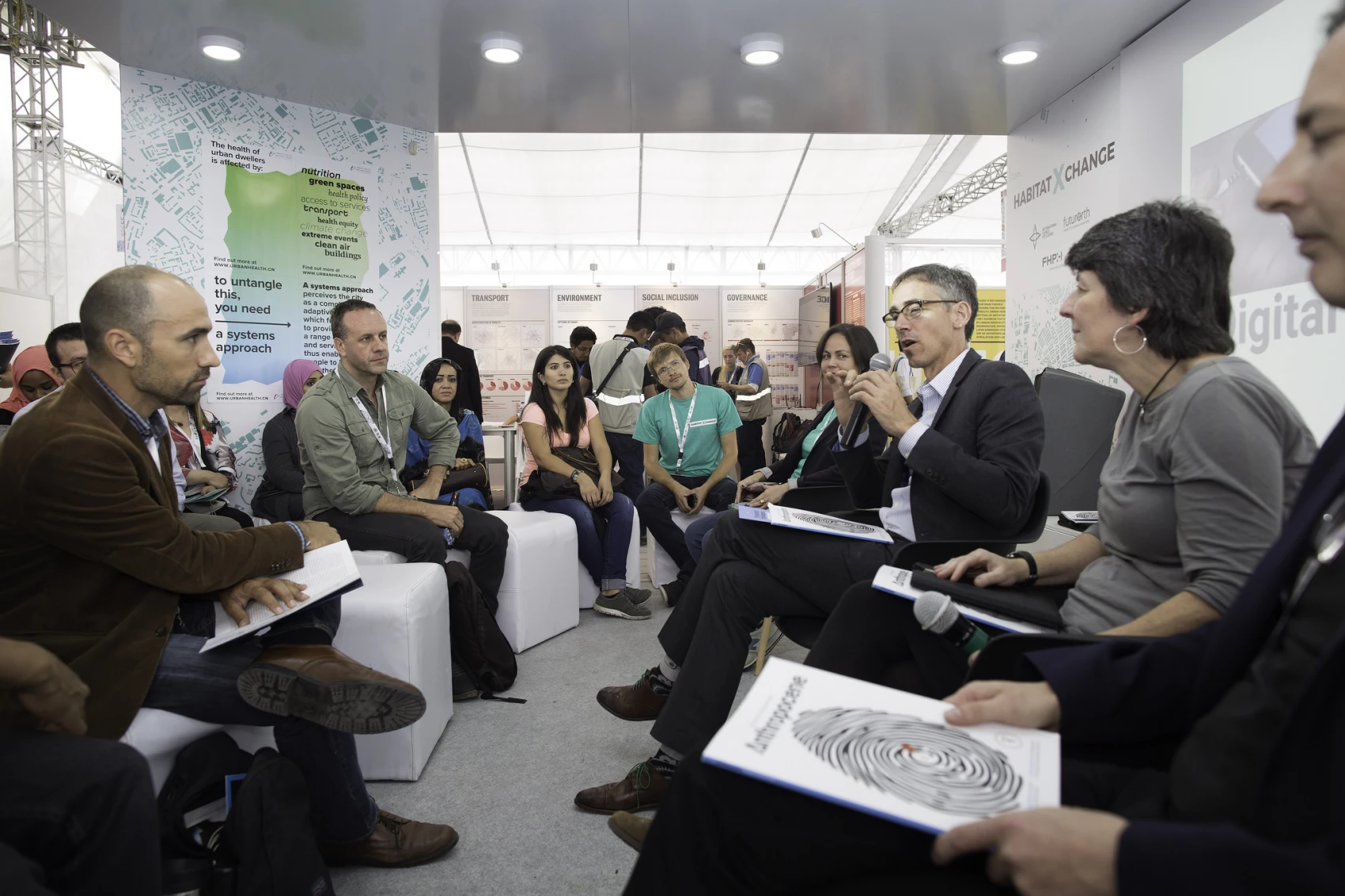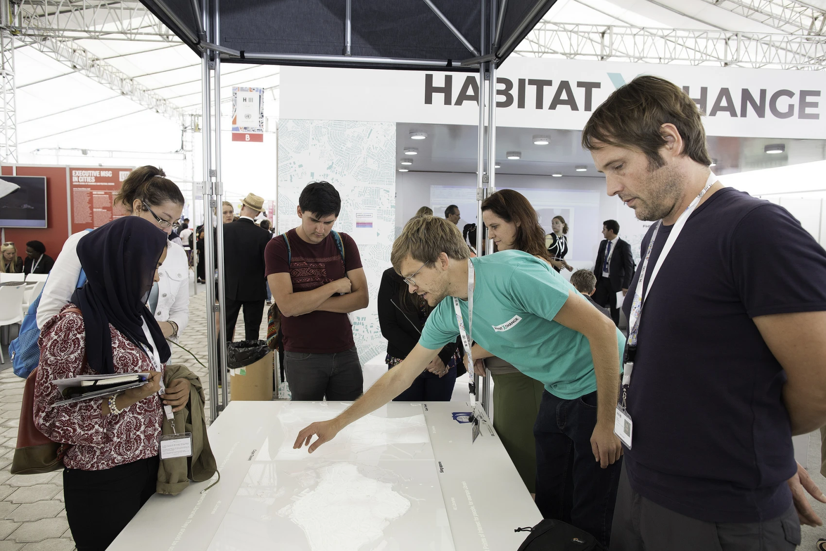 For Habitat III, the International Council for Science, the Future Earth initiative, and the Urban Complexity Lab with support from HERE launched the collaborative space “Habitat X Change”. Our aim was to connect scientists, policy makers, and visualization designers to jointly work towards a better future for cities. The ambition to connect the dots between the communities resulted in a packed line-up of events and an exhibition of cutting-edge visualization projects on cities from around the world.