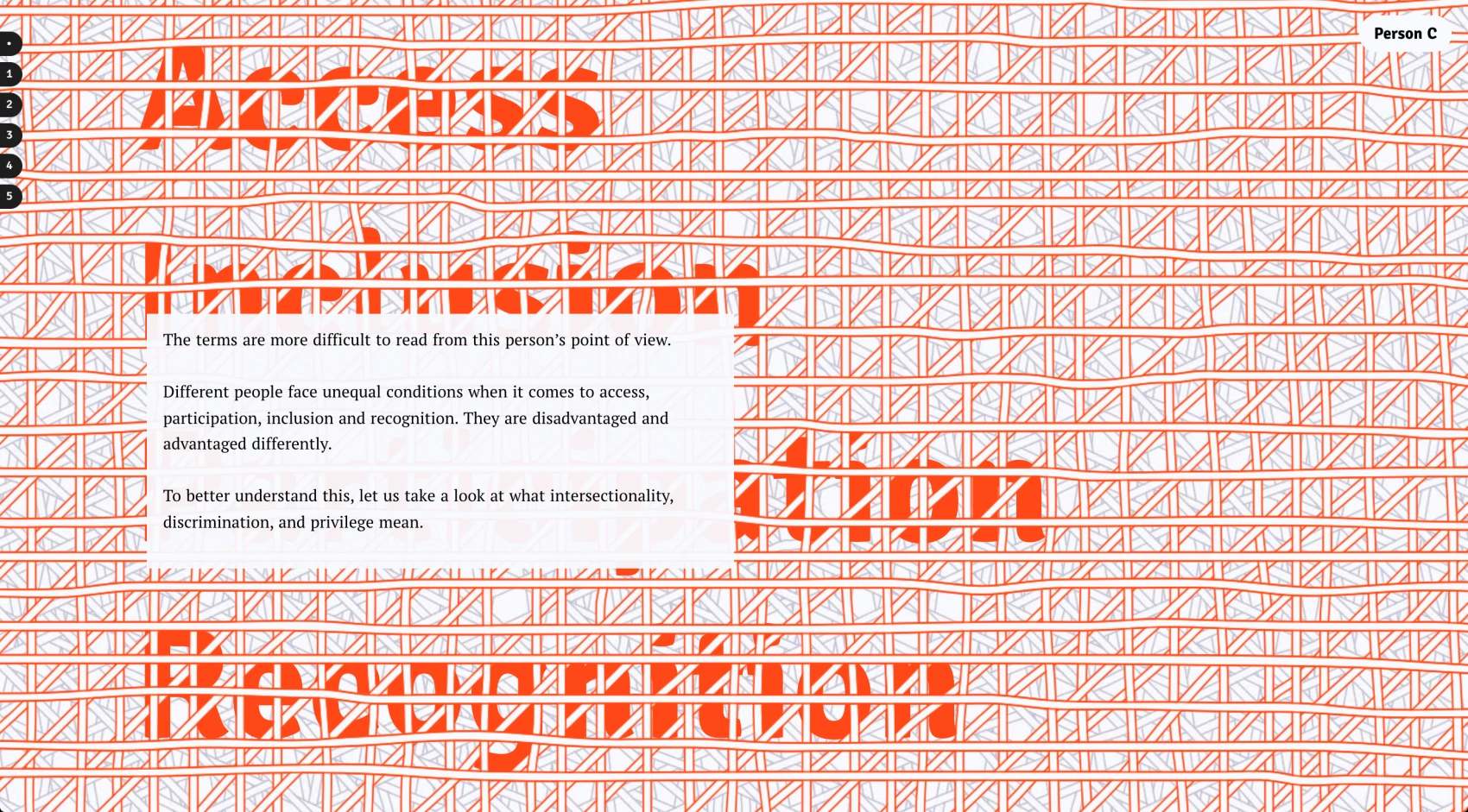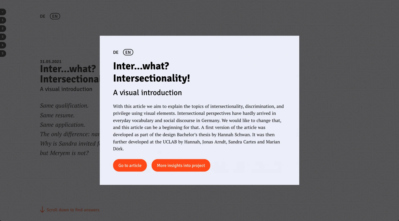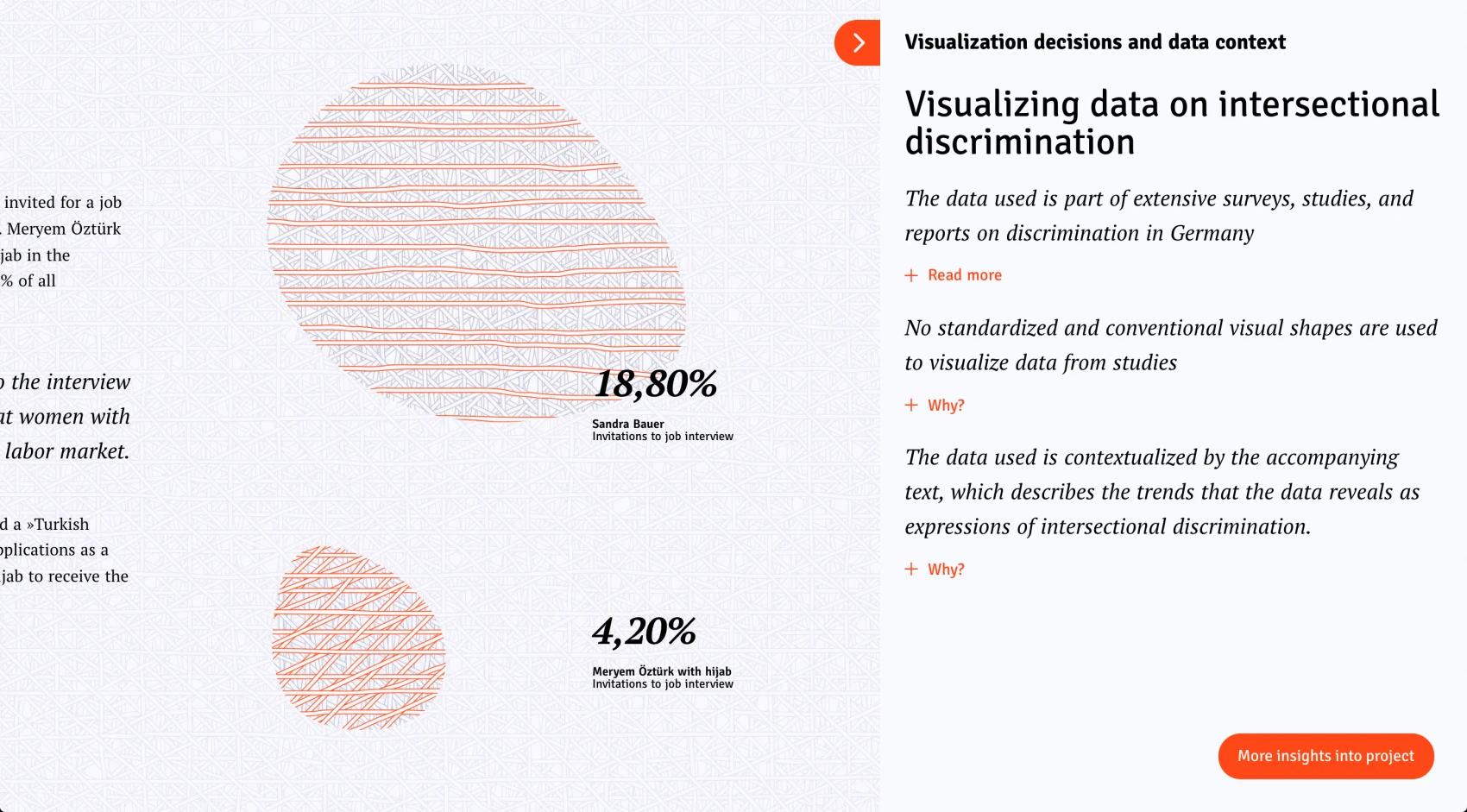 The text creates the framing for a scrollytelling article, and its additional translation into a customized visual language supports the communication of the issues. Case studies of intersectional discrimination in Germany are descriptively communicated by visualizing data from studies. The visual article provides thought-provoking impulses, inspires a change of perspective, and encourages further engagement and action.