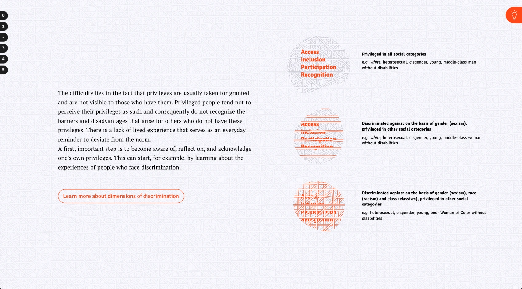 What is intersectionality? How are discrimination and privilege related? What does intersectional discrimination mean? These questions are addressed in the web-based article “Inter...what? Intersectionality! A visual introduction.” Using a combination of text, animated illustration, and interactive data visualization, it provides an introduction to the socially relevant topic of intersectional discrimination.