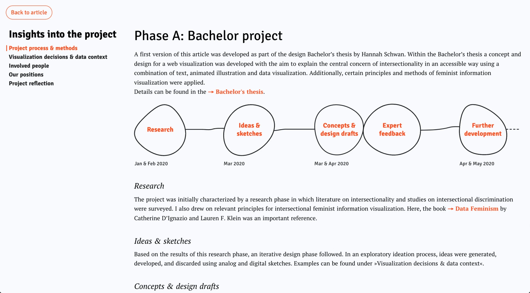Selected context information is additionally revealed: visualization decisions are made transparent and people involved visible. Embedded through specific visual interface elements, the project's process is disclosed, the positions of the authors are communicated, and the outcomes are critically reflected on.