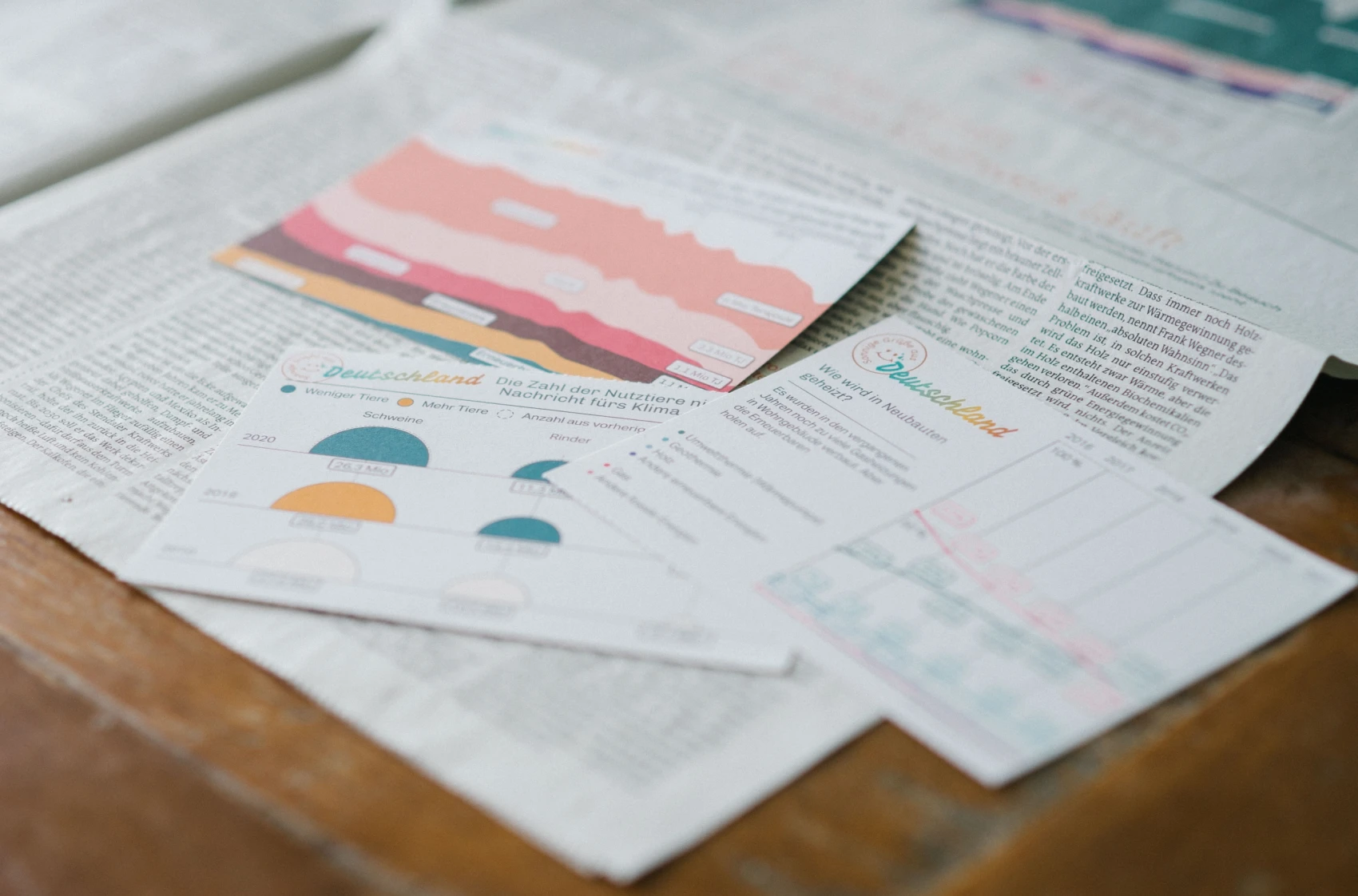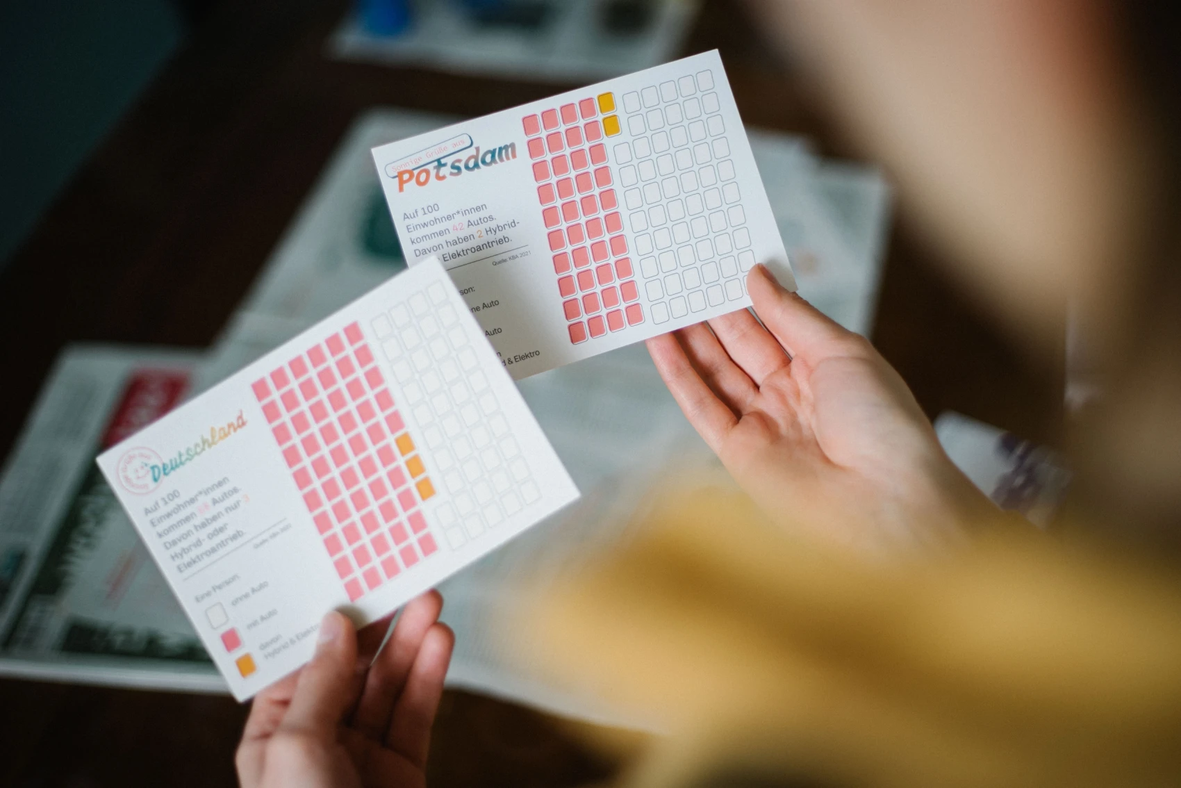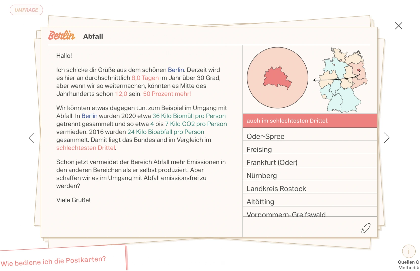 In collaboration with the newspaper taz, we designed and produced both physical and digital postcards containing visualizations covering various aspects of climate protection and mitigation in Germany. For each of the 401 districts and 16 states in Germany, readers can explore climate protection postcards concerning five sectors: energy, mobility, buildings, agriculture, and waste. The goal of our research is to study readers' engagement with data visualizations on the topic of climate protection across multiple media channels. A central ambition here is that the communication of climate change should not cause readers to feel anxious, numb, or even enter a state of shock, but develop an interest and engage locally with climate change and its ramifications.