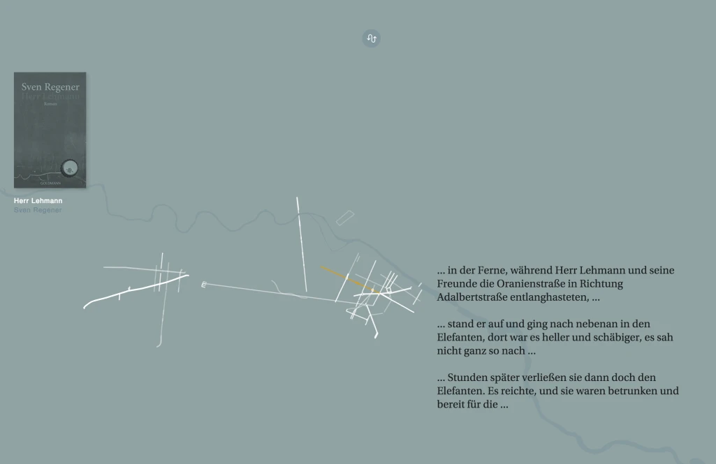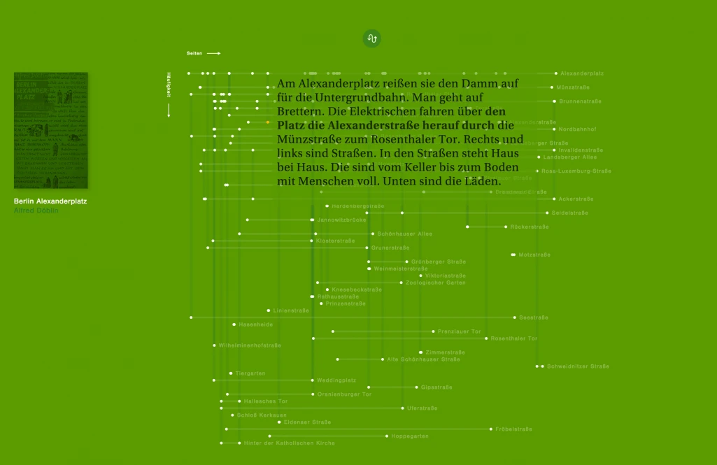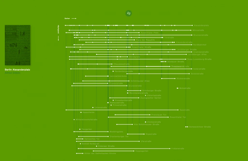 How do impressions of a city perceived in fiction change depending on author, time and narration? The project Novel City Maps visualizes spatiality and its relation to the story in Berlin novels in the form of poetic maps that originate from the complex tissue of the underlying stories.
