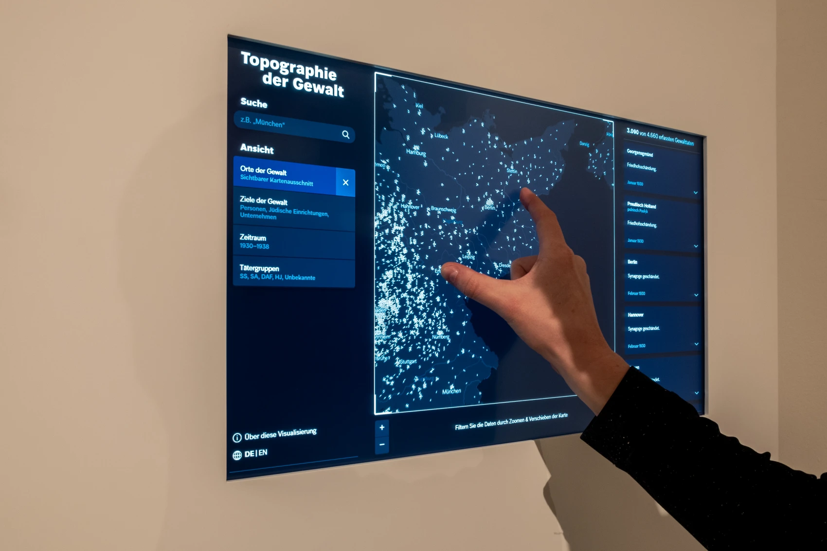 How can acts of violence be visualized in an appropriate manner? In cooperation with the Jewish Museum in Berlin, the project develops visualizations that present information about the dates and locations of many different acts of violence that took place between 1930 and 1938.
