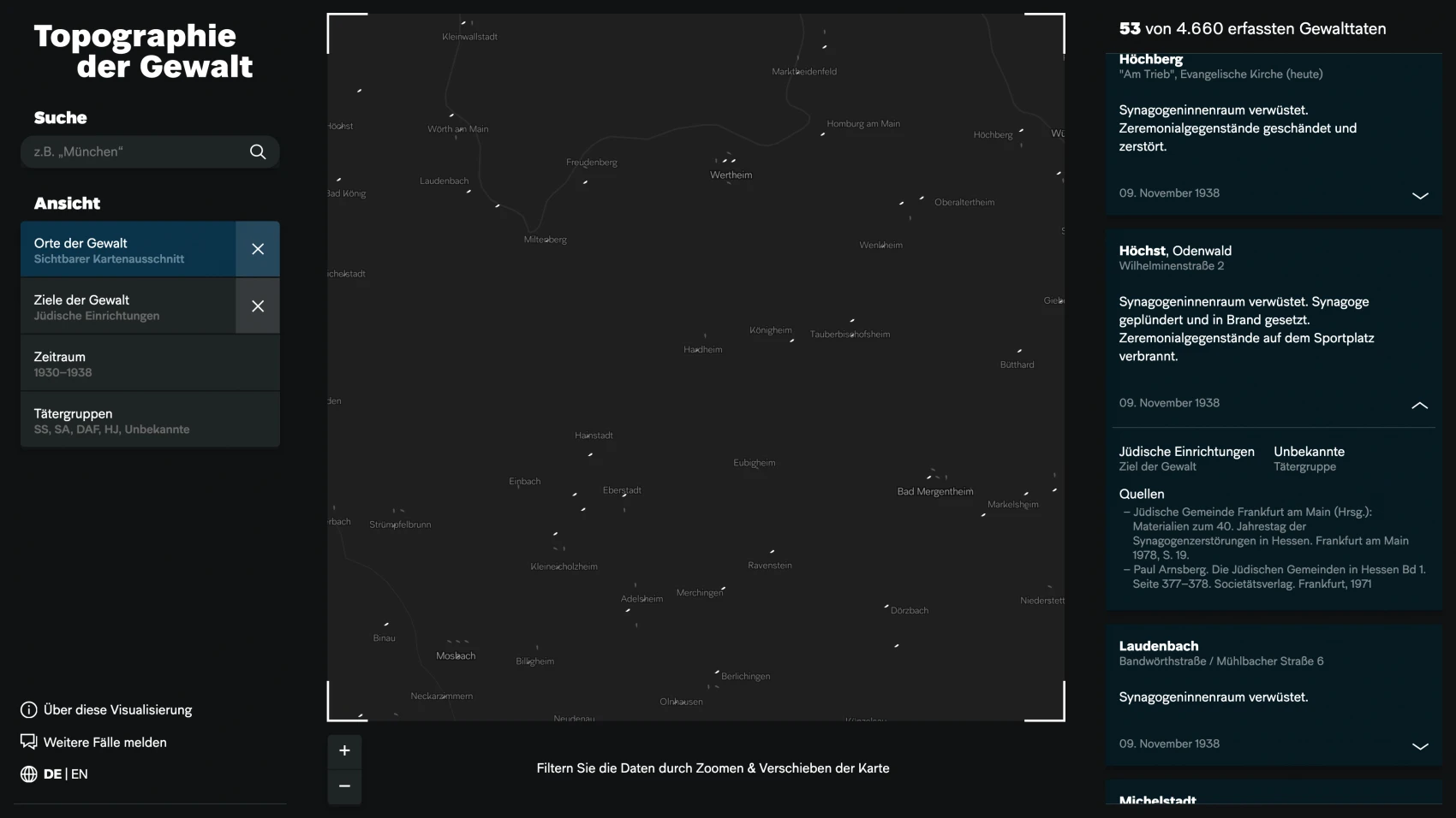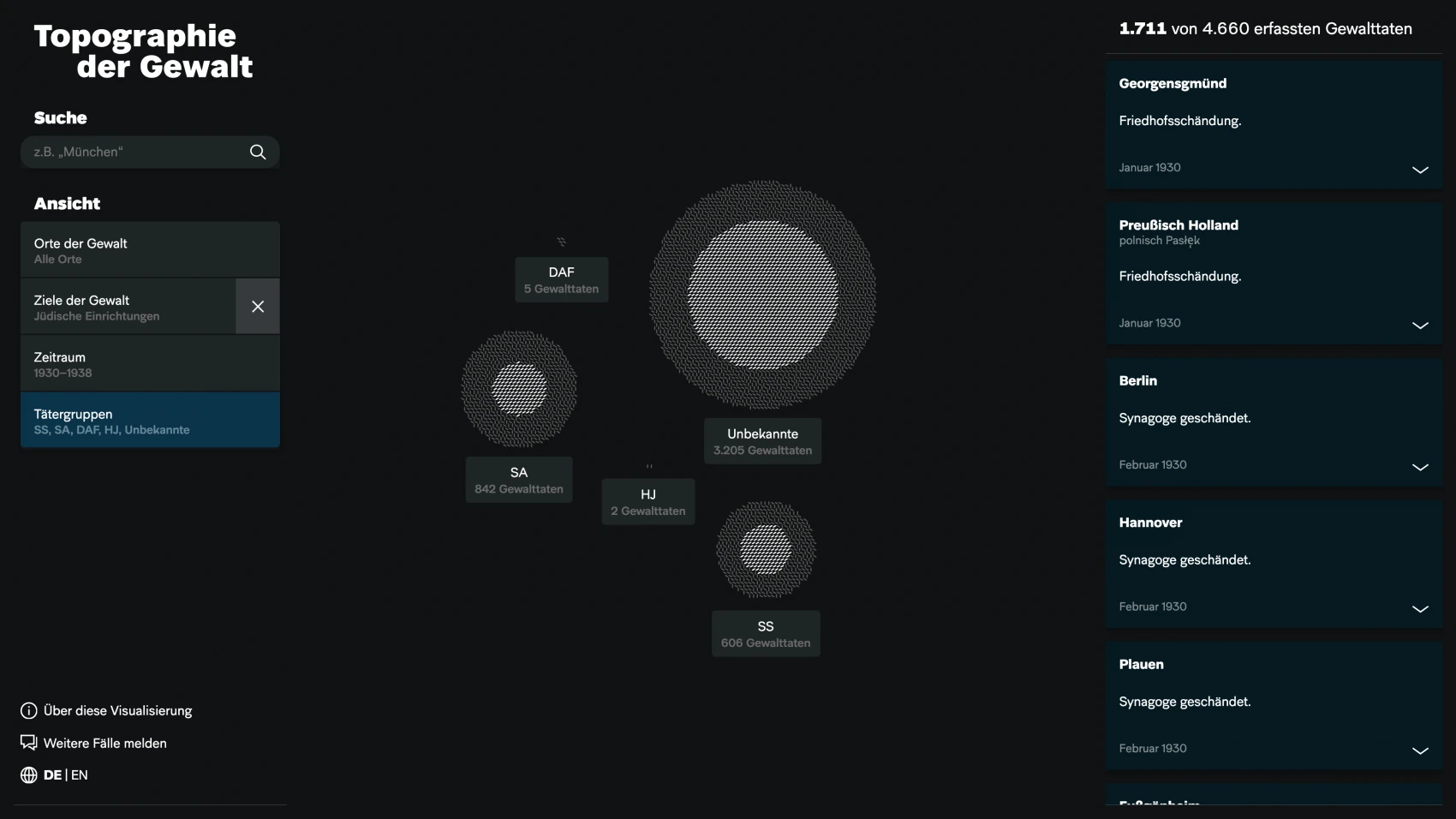 The visualization gives an overview of the acts of violence with their dates, locations, and perpetrators. The targets of violence are divided into three categories: individuals, Jewish institutions (synagogues, cemeteries, community institutions, private associations), and businesses (firms and stores). While the visualization does not provide a finalized or exhaustive survey of cases, visitors can search for particular places, years, or perpetrator groups. They are also invited to expand and enrich the data set by contributing their own knowledge of local incidents of violence.