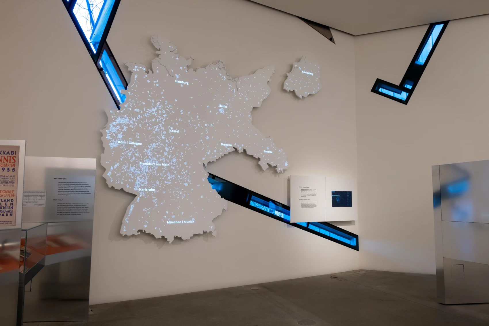 The data set used for the project draws from contemporary sources and from extensive local, regional, and national studies carried out over the past seventy years. The research project subsequently focuses on the question of how insightful, deliberate and ethical visualization forms can be found along interactive modes, enabling an animated overview and interactive exploration as well as the participatory enrichment of the data set. The results are an animated wall map and media station, which are integrated into the new permanent exhibition of the Jewish Museum Berlin, as well as a web-based visualization.